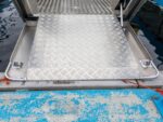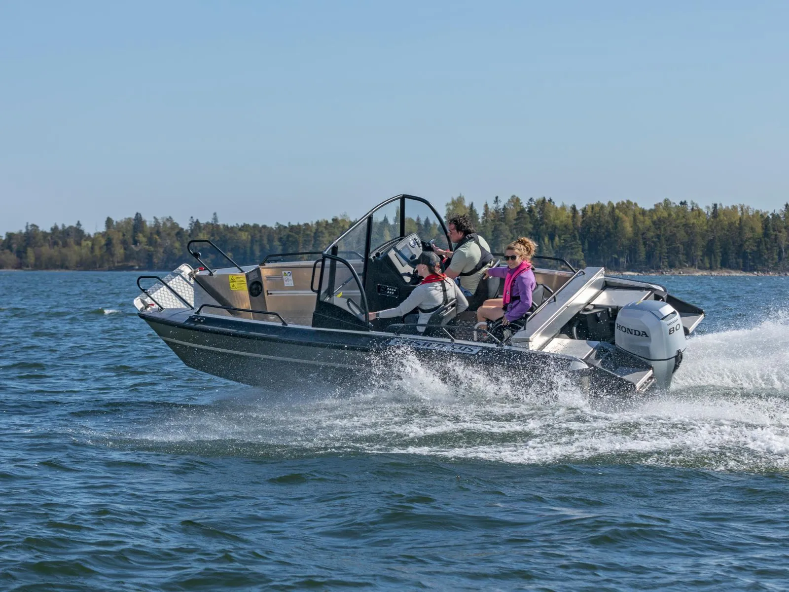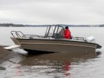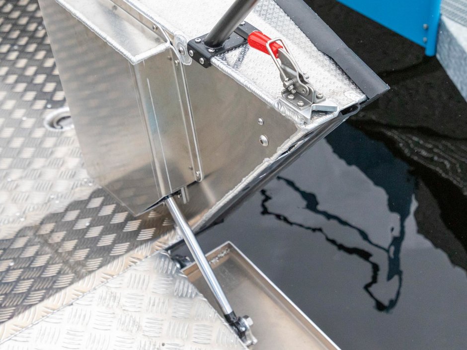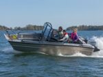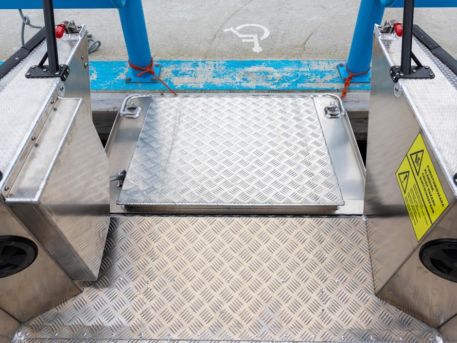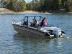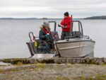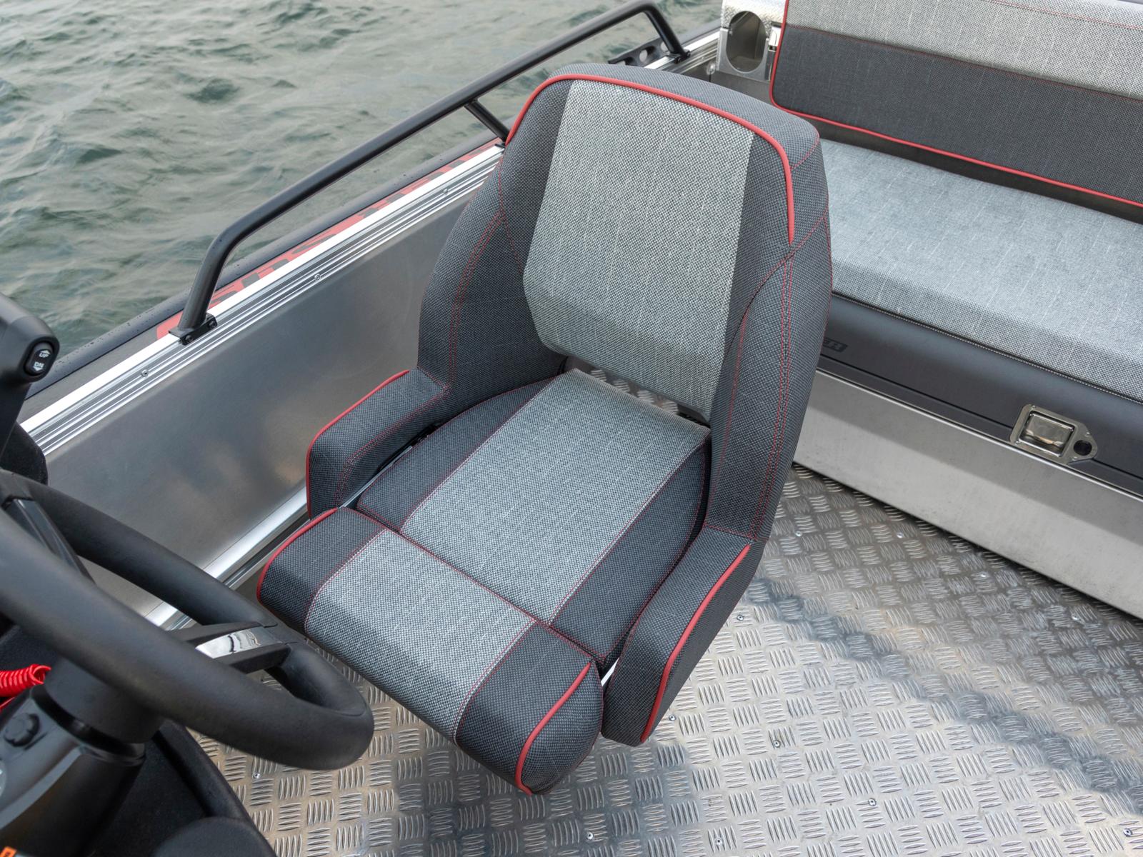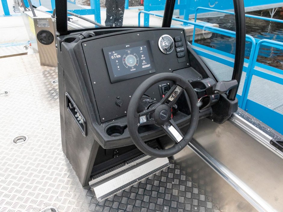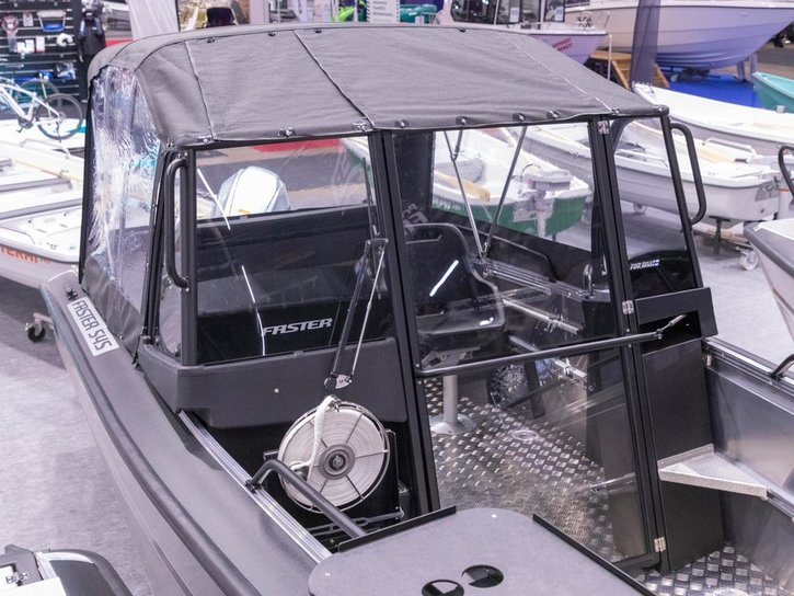 Placeringen av styrpulpeterna har nog övervägts tillsammans med Konttinen. Förarens styrpulpet är bekant från Faster 545 SC, men kartläsarens styrpulpet har däremot ersatts med en smalare bordsyta samt grabbräcke. Detta för att göra det möjligast hindersfritt att passera genom den skyddande mellandörren samt för att med rullstol kunna svänga smidigt in på förarplats. Vi har även gjort pulpeternas mellandörr något bredare, för att en rullstolsanvändare enkelt skall rymmas att passera. På förarens instrumentpanel finns som bekant en 9-tums Raymarine Axiom+ -kartplotter med CPT-S-givare samt alla nödvändiga mätare och strömbrytare vid räckhåll. Ramen för vindrutan, som ger gott vindskydd åt alla passagerare som sitter akteröver, fungerar samtidigt som grabbräcke vilket ökar säkerheten ombord. Säkerhetens förbättras ytterligare av de välplacerade räckena som finns både i fören och aktern. Båtens höga fribord spelar även en stor roll gällande trygghetskänslan. Aluminiumdurken är plan och jämn så att rörelse ombord är möjligast bekvämt och tryggt, och på den stora främre durken kan enkelt större packning/förnödenheter transporteras samt enkelt fästas. Den öppna fördurken lämpar sig även gott för kastfiske.