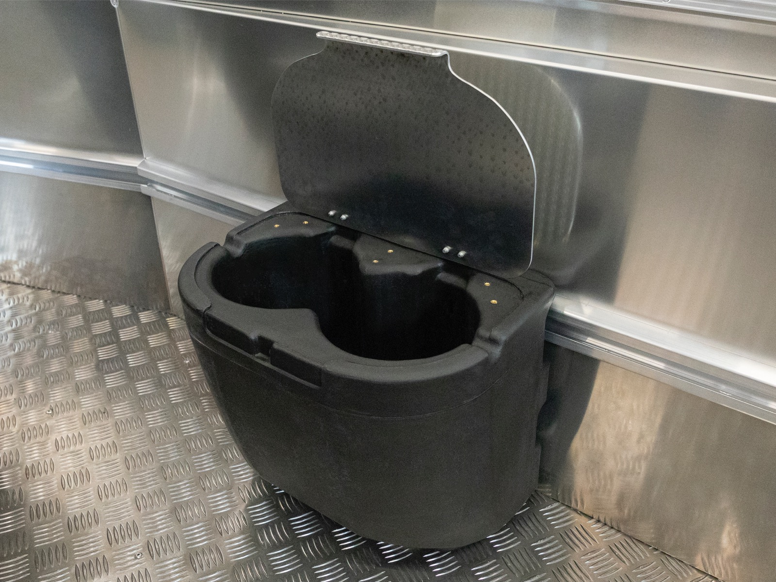 Hållare för förtöjningslinor med aluminiumlock, som samtidigt fungerar som trappsteg. Fästes i C-skena.