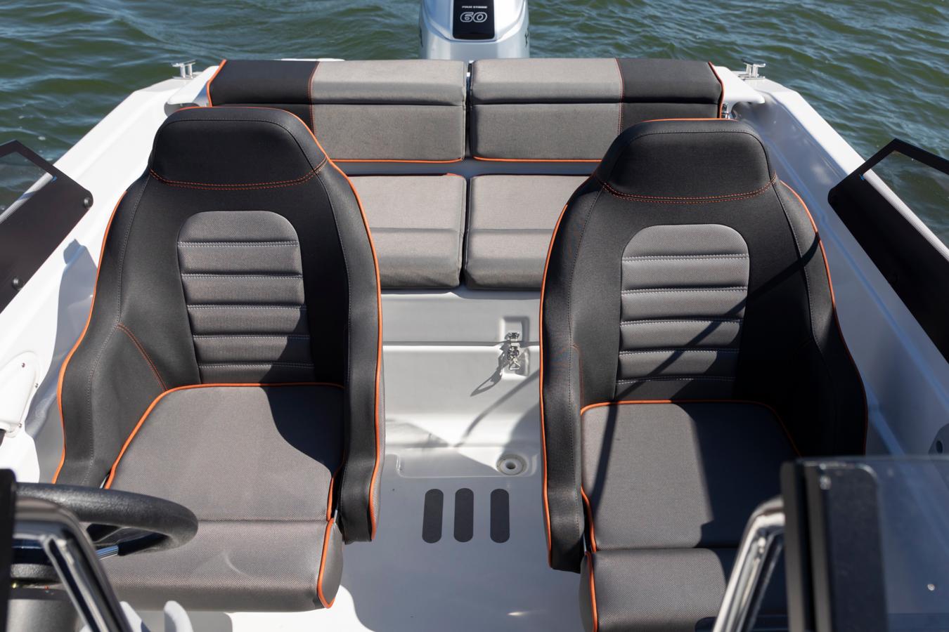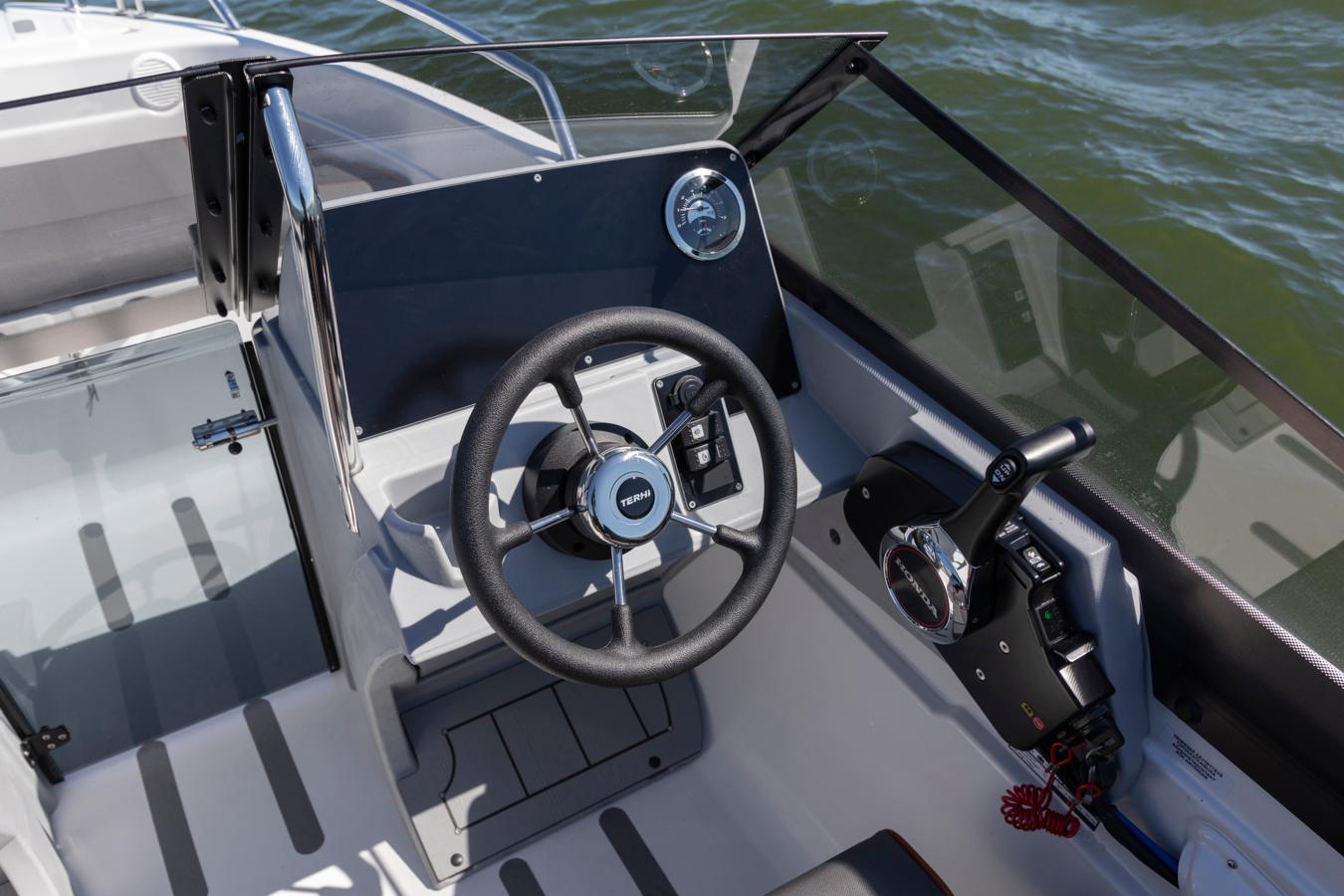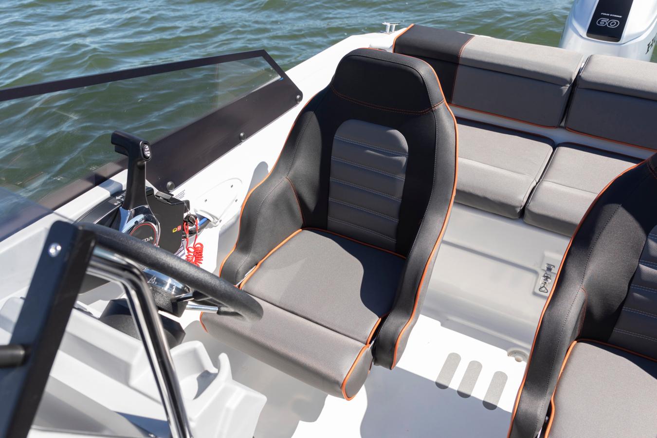Båtens dubbla styrpulpeter tillsammans med den tillhörande tvådelade mellandörren bildar ett skyddat passagerarutrymme i aktern för upp till fem vuxna. Förare och kartläsare sitter i varsin bekväm, helstoppad komfortstol, och på den breda akterbänken får 2-3 vuxna lätt plats. Båtens styrpulpeter har designats med tanke på nutidens användare. I pulpeterna finns förvaringsplats för småsaker samt ställ för dricksflaska. Därutöver har pulpeterna eluttag, två låsbara handskfack samt på instrumentpanelen plats för en kartplotter. I fören finns ett stort förvaringsutrymme under förtoften samt en låda för tampar, och i aktern finns förutom det rymliga stuvutrymmet under akterbänken även två lådor för tampar/ankare och ett kapellgarage. Alla stuvutrymmen, förutom tamparnas förvaringslådor, är möjliga att låsa med separat lås.