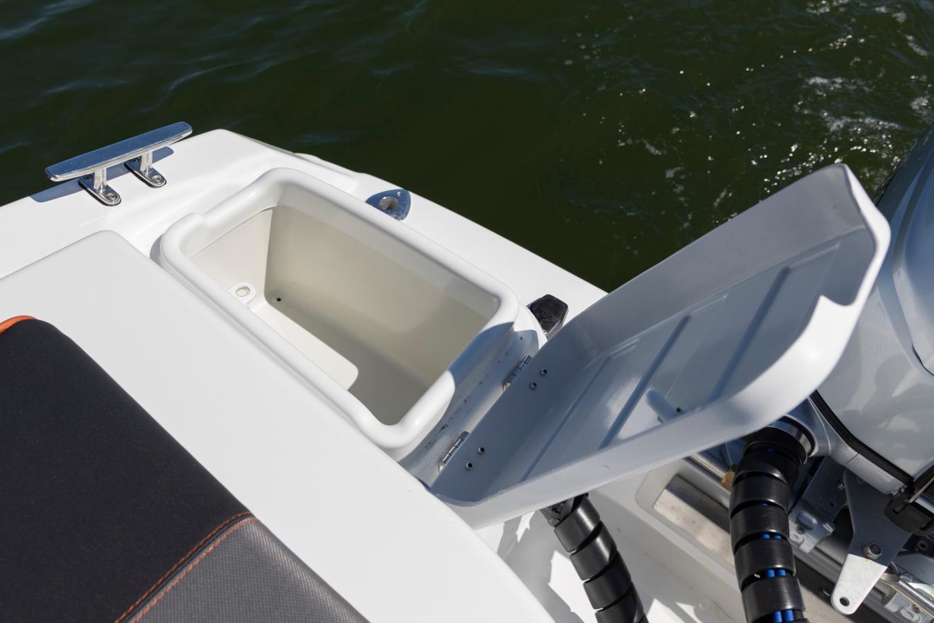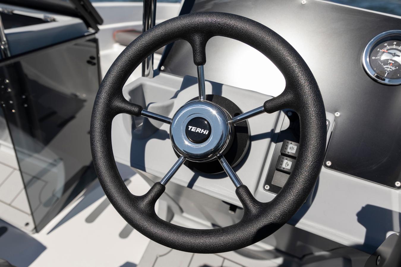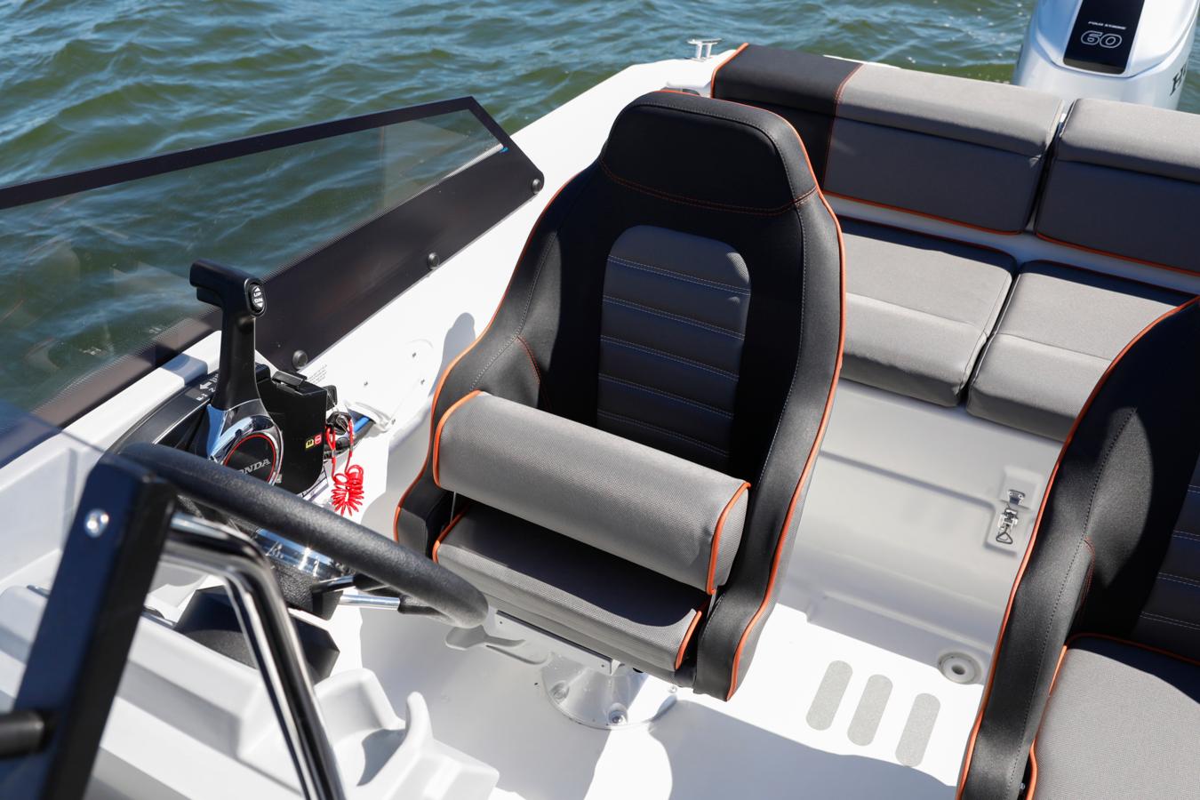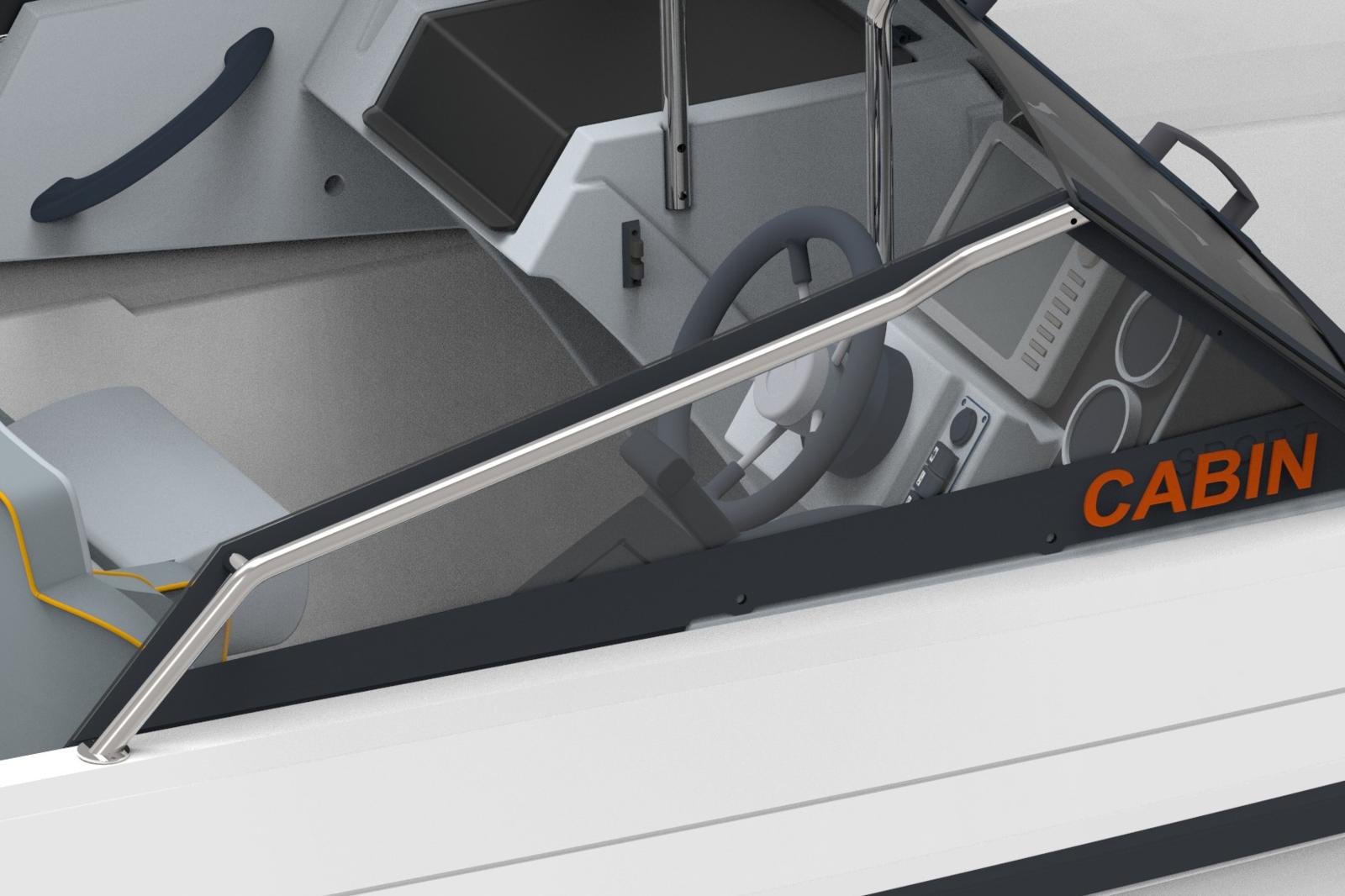 Båtens dubbla styrpulpeter tillsammans med den tillhörande tvådelade mellandörren bildar ett skyddat passagerarutrymme i aktern för upp till fem vuxna. Förare och kartläsare sitter i varsin bekväm, helstoppad komfortstol, och på den breda akterbänken får 2-3 vuxna lätt plats. Båtens styrpulpeter har designats med tanke på nutidens användare. I pulpeterna finns förvaringsplats för småsaker samt ställ för dricksflaska. Därutöver har pulpeterna eluttag, två låsbara handskfack samt på instrumentpanelen plats för en kartplotter. I fören finns ett stort förvaringsutrymme under förtoften samt en låda för tampar, och i aktern finns förutom det rymliga stuvutrymmet under akterbänken även två lådor för tampar/ankare och ett kapellgarage. Alla stuvutrymmen, förutom tamparnas förvaringslådor, är möjliga att låsa med separat lås.